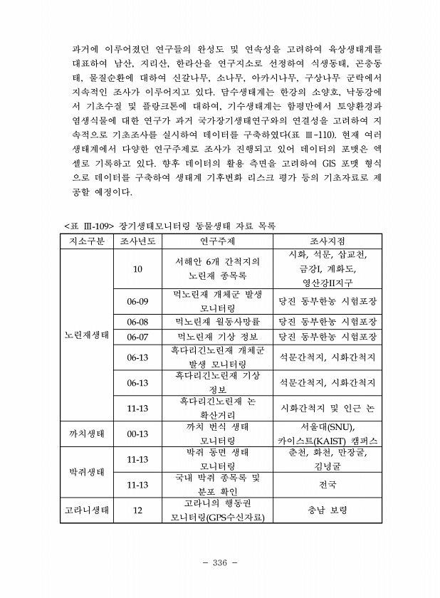 336 과거에 이루어졌던 연구들의 완성도 및 연속성을 고려하여 육상생태계를 대표하여 남산, 지리산, 한라산을 연구지소로 선정하여 식생동태, 곤충동 태, 물질순환에 대하여 신갈나무, 소나무, 아카시나무, 구상나무 군락에서 지속적인 조사가 이루어지고 있다. 담수생태계는 한강의 소양호, 낙동강에 서 기초수질 및 플랑크톤에 대하여, 기수생태계는 함평만에서 토양환경과 염생식물에 대한 연구가 과거 국가장기생태연구와의 연결성을 고려하여 지 속적으로 기초조사를 실시하여 데이터를 구축하였다 표 Ⅲ-110 현재 여러 생태계에서 다양한 연구주제로 조사가 진행되고 있어 데이터의 포맷은 엑 셀로 기록하고 있다. 향후 데이터의 활용 측면을 고려하여 GIS 포맷 형식 으로 데이터를 구축하여 생태계 기후변화 리스크 평가 등의 기초자료로...