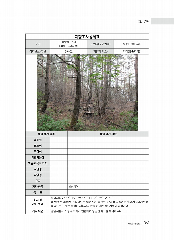 Ⅲ. 부록 www.nie.re.kr ? 361 지형조사상세표 구간 화방재댓재 피재구부시령 도엽명 도엽번호 광동 378124 격자번호-연번 E9-02 지형명 기호 기타 훼손지역 등급 평가 항목 등급 평가 기준 대표성 희소성 특이성 재현가능성 학술?교육적 가치 자연성 다양성 규모 기타 항목 훼손지역 등 급 위치 및 사진 설명 촬영지점 N37°15′29.52″, E127°59′55.81″ 피재 삼수령 에서 건의령으로 이어지는 등산로 5.5km 지점에는 촬영지점에서부터 북쪽으로 1.8km 떨어진 지점까지 산불로 인한 훼손지역이 나타난다. 기타 의견 촬영지점과 지형의 위치가 인접하여 동일한 좌표를부여하였다.