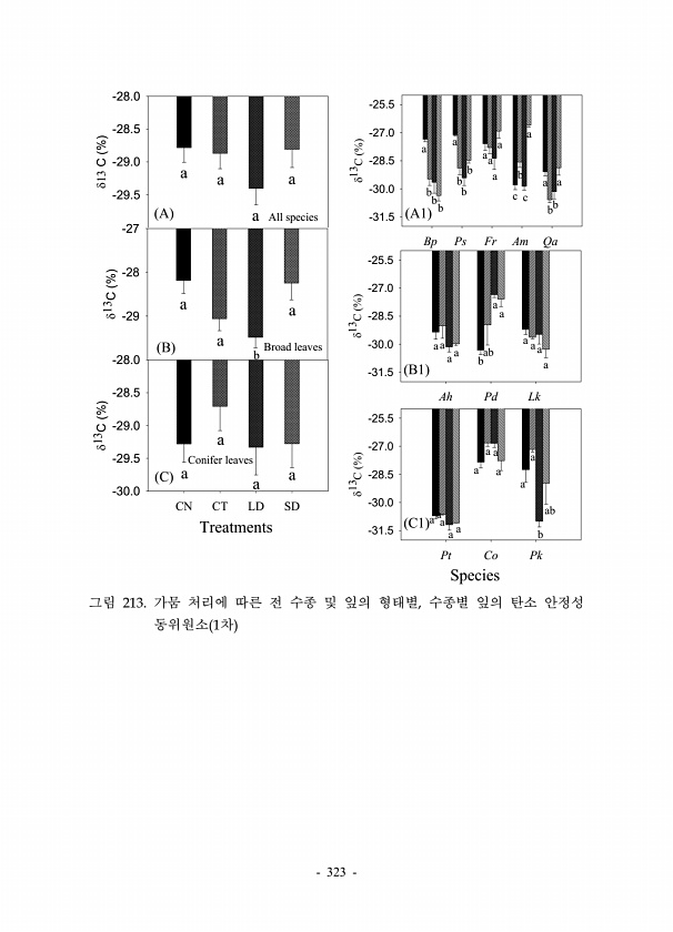 323 Bp Ps Fr Am Qa ???C % -31.5 -30.0 -28.5 -27.0 -25.5 A1 Ah Pd Lk ???C % -31.5 -30.0 -28.5 -27.0 -25.5 B1 Species Pt Co Pk ???C % -31.5 -30.0 -28.5 -27.0 -25.5 C1 a b b b a bb b a aa a c b a c a b a b a a a a b ab a a a a a a a a a a a a a a a a b ab ????C % -29.5 -29.0 -28.5 -28.0 ???C % -29 -28 -27 Treatments CN CT LD SD ???C % -30.0 -29.5 -29.0 -28.5 -28.0 a a a a All species a a a b Broad le...