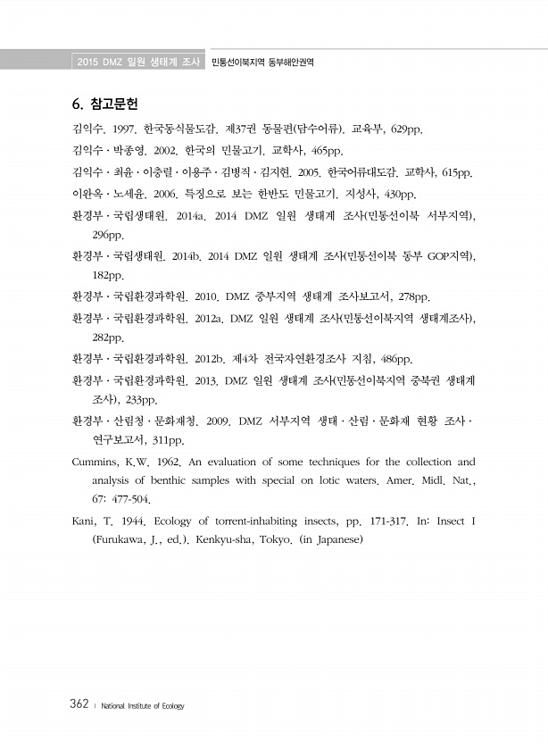 2015 DMZ 일원 생태계 조사 민통선이북지역 동부해안권역 362 ? National Institute of Ecology 6. 참고문헌 김익수. 1997. 한국동식물도감. 제37권 동물편 담수어류 교육부, 629pp. 김익수·박종영. 2002. 한국의 민물고기. 교학사, 465pp. 김익수·최윤·이충렬·이용주·김병직·김지현. 2005. 한국어류대도감. 교학사, 615pp. 이완옥·노세윤. 2006. 특징으로 보는 한반도 민물고기. 지성사, 430pp. 환경부·국립생태원. 2014a. 2014 DMZ 일원 생태계 조사 민통선이북 서부지역 , 296pp. 환경부·국립생태원. 2014b. 2014 DMZ 일원 생태계 조사 민통선이북 동부 GOP지역 , 182pp. 환경부·국립환경과학원. 2010. DMZ 중부...
