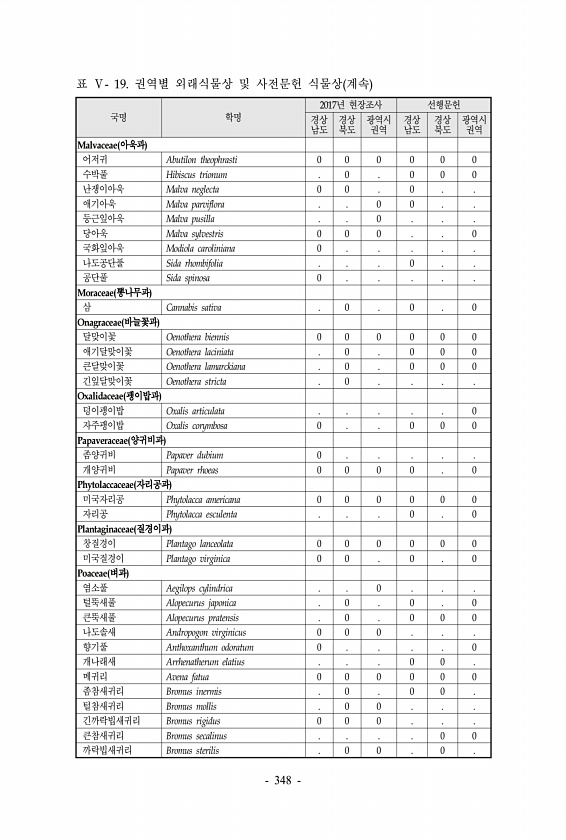표 Ⅴ- 19. 권역별 외래식물상 및 사전문헌 식물상 계속 국명 학명 2017년 현장조사 선행문헌 경상 남도 경상 북도 광역시 권역 경상 남도 경상 북도 광역시 권역 Malvaceae 아욱과 어저귀 Abutilon theophrasti 0 0 0 0 0 0 수박풀 Hibiscus trionum 0 0 0 0 난쟁이아욱 Malva neglecta 0 0 0 애기아욱 Malva parviflora 0 0 둥근잎아욱 Malva pusilla 0 당아욱 Malva sylvestris 0 0 0 0 국화잎아욱 Modiola caroliniana 0 나도공단풀 Sida rhombifolia 0 공단풀 Sida spinosa 0 Moraceae 뽕나무과 삼 Cannabis sativa 0 0 0 Onagraceae 바늘...