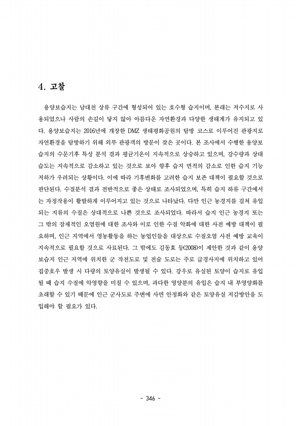 346 용양보습지는 남대천 상류 구간에 형성되어 있는 호수형 습지이며 본래는 저수지로 사 , 용되었으나 사람의 손길이 닿지 않아 아름다운 자연환경과 다양한 생태계가 유지되고 있 다. 용양보습지는 년 2016 에 개장한 생태평화공원의 탐방 코스로 이루어진 관광지로 DMZ 자연환경을 탐방하기 위해 외부 관광객의 방문이 잦은 곳이다 본 조사에서 수행한 용양보 습지의 수문기후 특성 분석 결과 평균기온이 지속적으로 상승하고 있으며 강수량과 상대 , 습도는 지속적으로 감소하고 있는 것으로 보아 향후 습지 면적의 감소로 인한 습지 기능 저하가 우려되는 상황이다 이에 따라 기후변화를 고려한 습지 보존 대책이 필요할 것으로 판단된다 수질분석 결과 전반적으로 좋은 상태로 조사되었으며 특히 습지 하류 구간에서 , 는 자정작용이...