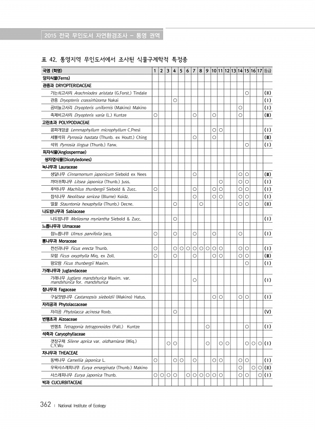 2015 전국 무인도서 자연환경조사 통영 권역 362 ? National Institute of Ecology 국명 학명 1 2 3 4 5 6 7 8 9 10 11 12 13 14 15 16 17 등급 양치식물 Ferns 관중과 DRYOPTERIDACEAE 가는쇠고사리 Arachniodes aristata G.Forst. Tindale ○ Ⅱ 관중 Dryopteris crassirhizoma Nakai ○ Ⅰ 곰비늘고사리 Dryopteris uniformis Makino Makino ○ Ⅰ 족제비고사리 Dryopteris varia L. Kuntze ○ ○ ○ ○ Ⅲ 고란초과 POLYPODIACEAE 콩짜개덩굴 Lemmaphyllum microphyllum C.Presl ○ ○ Ⅰ 세뿔석위 Pyrrosia ...