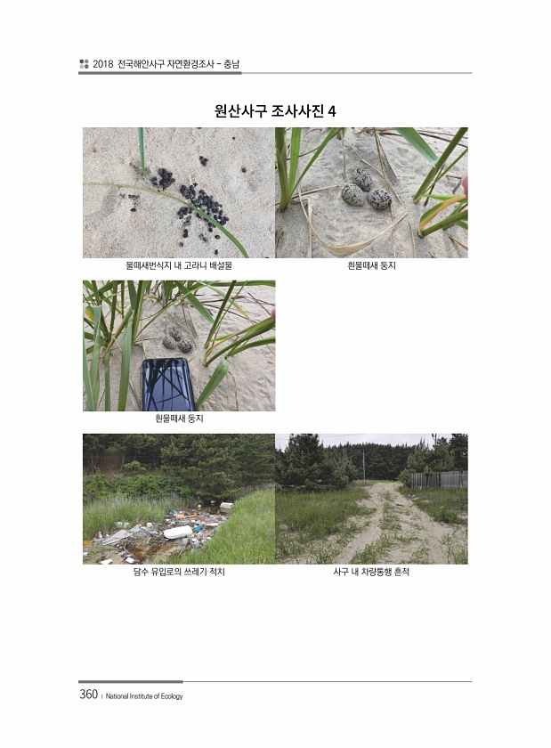 2018 전국해안사구 자연환경조사 충남 360 ? National Institute of Ecology 물떼새번식지 내 고라니 배설물 흰물떼새 둥지 흰물떼새 둥지 담수 유입로의 쓰레기 적치 사구 내 차량통행 흔적4