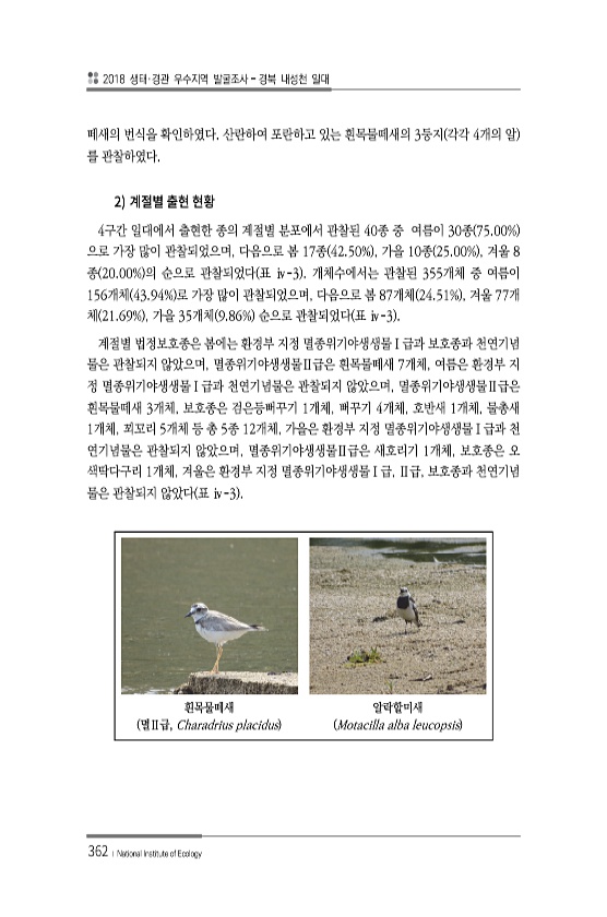 2018 생태·경관 우수지역 발굴조사 경북 내성천 일대 362 ? National Institute of Ecology 떼새의 번식을 확인하였다. 산란하여 포란하고 있는 흰목물떼새의 3둥지 각각 4개의 알 를 관찰하였다. 2 4구간 일대에서 출현한 종의 계절별 분포에서 관찰된 40종 중 여름이 30종 75.00% 으로 가장 많이 관찰되었으며, 다음으로 봄 17종 42.50% , 가을 10종 25.00% , 겨울 8 종 20.00% 의 순으로 관찰되었다 표 ⅳ-3 개체수에서는 관찰된 355개체 중 여름이 156개체 43.94% 로 가장 많이 관찰되었으며, 다음으로 봄 87개체 24.51% , 겨울 77개 체 21.69% , 가을 35개체 9.86% 순으로 관찰되었다 표 ⅳ-3 계절별 법정보호종은 봄에는 환경부...