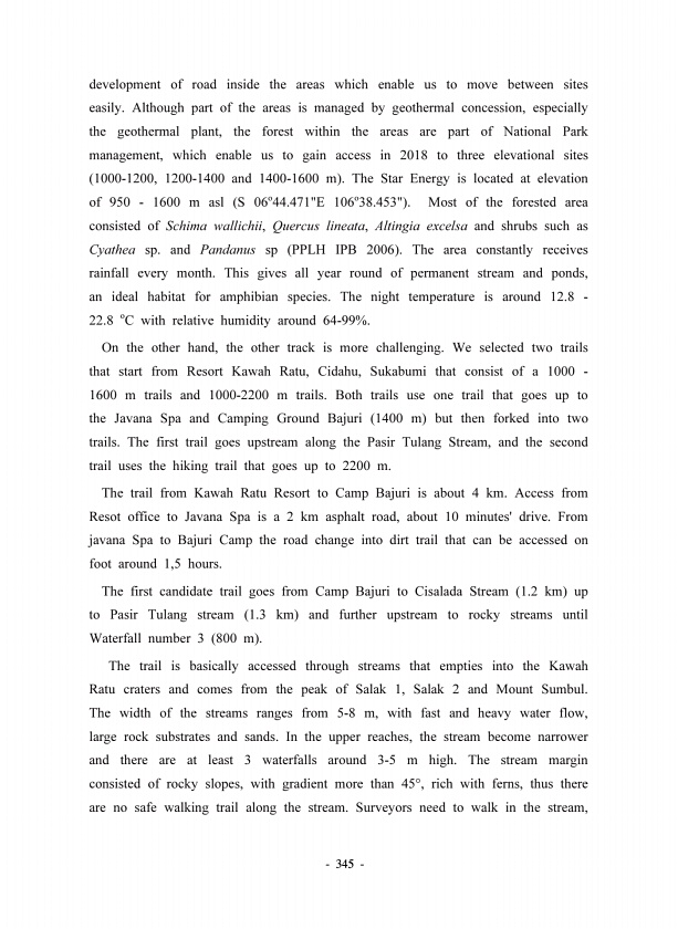 345 development of road inside the areas which enable us to move between sites easily. Although part of the areas is managed by geothermal concession, especially the geothermal plant, the forest within the areas are part of National Park management, which enable us to gain access in 2018 to three elevational sites 1000-1200, 1200-1400 and 1400-1600 m The Star Energy is located at elevation of 950 ...