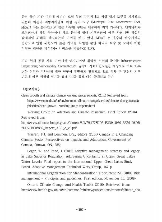 한편 국가 기관 이외에 캐나다 보험 협회 차원에서도 위험 평가 도구를 제시하고 있는데 이른바 지방자치단체 위험 평가 도구 Municipal Risk Assessment Tool, MRAT 라는 온라인으로 접근 가능한 수단을 제공하여 지역 커뮤니티, 엔지니어와 보험회사가 사업 구상이나 사고 분석에 있어 기후변화에 따른 사회기반 시설의 잠재적인 피해를 방지하는데 기여를 하고 있다. MRAT 은 홍수와 하수시설의 범람으로 인한 위험도가 높은 지역을 식별할 뿐만 아니라 보수 및 교체에 대한 적절한 대안을 제시하는 서비스를 제공하고 있다. 기타 현재 공공 사회 기반시설 엔지니어링 취약성 위원회 Public Infrastructure Engineering Vulnerability Committee 의 규약이 사회기반시...