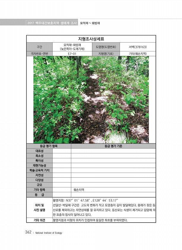 2017 백두대간보호지역 생태계 조사 묘적재 화방재 362 ? National Institute of Ecology 지형조사상세표 구간 묘적재화방재 늦은목이도래기재 도엽명 도엽번호 서벽 378163 격자번호-연번 E7-01 지형명 기호 기타 훼손지역 등급 평가 항목 등급 평가 기준 대표성 희소성 특이성 재현가능성 학술?교육적 가치 자연성 다양성 규모 기타 항목 훼손지역 등 급 위치 및 사진 설명 촬영지점 N37°01′47.58″, E128°44′53.17″ 선달산박달재 구간은 고도의 변화가 작고 토양층이 깊이 발달해있다. 왕래가 잦은 등 산로를 제외하고는 자연상태를 잘 유지하고 있다. 등산로는 식생이 제거되고 답압에 의 한 표층의 침식이 일어나고 있다. 기타 의견 촬영지점과 지형의 위치가 인접하여 동일한 좌...