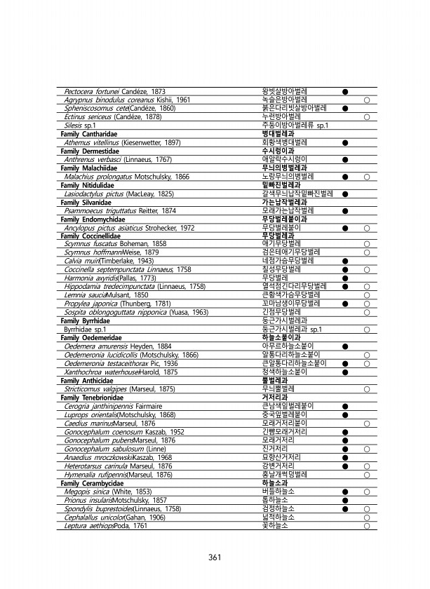 361 Pectocera fortunei Cand?ze, 1873 왕빗살방아벌레 ● Agrypnus binodulus coreanus Kishii, 1961 녹슬은방아벌레 ○ Spheniscosomus cete Cand?ze, 1860 붉은다리빗살방아벌레 ● Ectinus sericeus Cand?ze, 1878 누런방아벌레 ○ Silesis sp.1 주둥이방아벌레류 sp.1 Family Cantharidae 병대벌레과 Athemus vitellinus Kiesenwetter, 1897 회황색병대벌레 ● Family Dermestidae 수시렁이과 Anthrenus verbasci Linnaeus, 1767 애알락수시렁이 ● Family Malachiidae 무늬의병벌레과 Malachius prolongat...