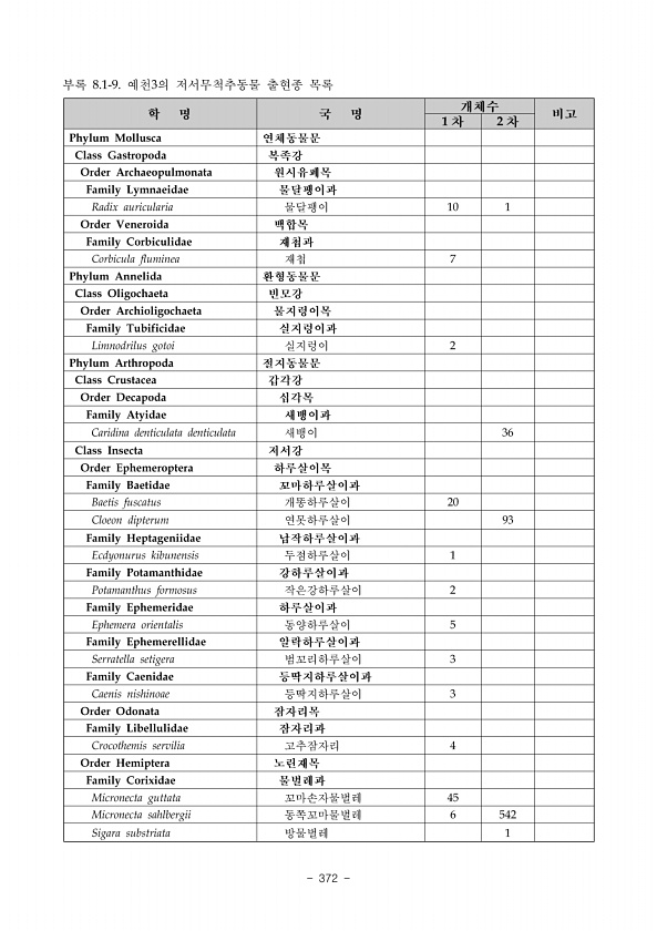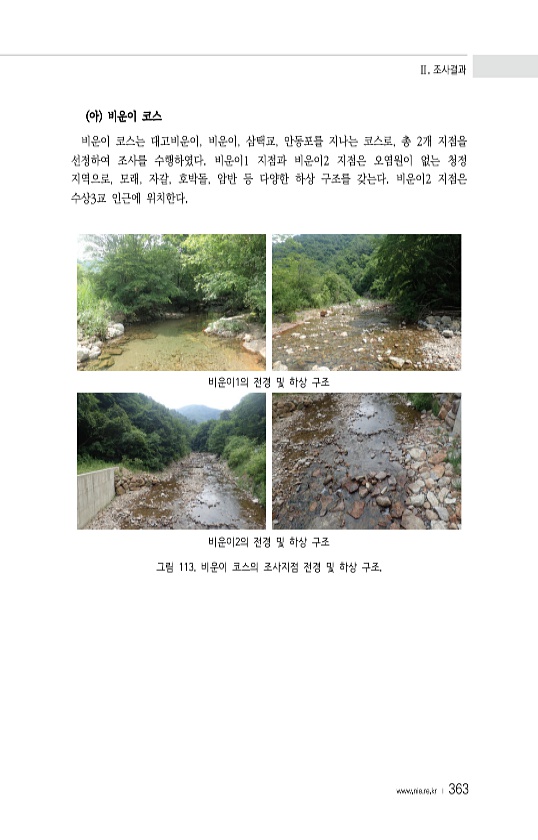 Ⅱ. 조사결과 www.nie.re.kr ? 363 아 비운이 코스 비운이 코스는 대고비운이, 비운이, 삼택교, 안동포를 지나는 코스로, 총 2개 지점을 선정하여 조사를 수행하였다. 비운이1 지점과 비운이2 지점은 오염원이 없는 청정 지역으로, 모래, 자갈, 호박돌, 암반 등 다양한 하상 구조를 갖는다. 비운이2 지점은 수상3교 인근에 위치한다. 비운이1의 전경 및 하상 구조 비운이2의 전경 및 하상 구조 그림 113. 비운이 코스의 조사지점 전경 및 하상구조.
