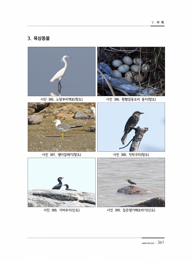 Ⅴ. 부 록 www.nie.re.kr ? 361 3. 육상동물 사진 385. 노랑부리백로 항도 사진 386. 흰뺨검둥오리 둥지 항도 사진 387. 괭이갈매기 항도 사진 388. 직박구리 항도 사진 389. 가마우지 신도 사진 390. 검은댕기해오라기 신도