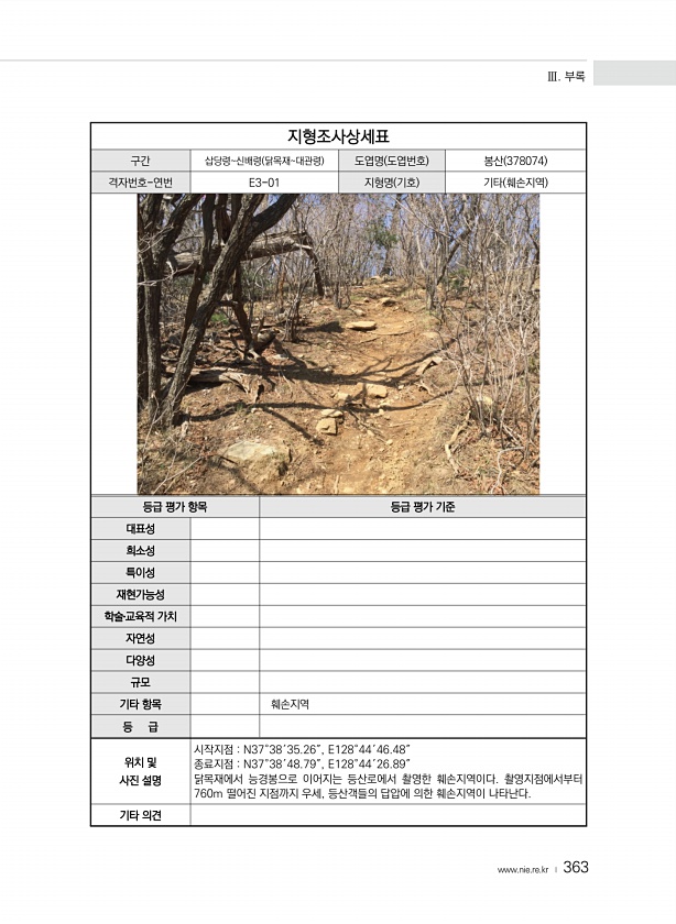Ⅲ. 부록 www.nie.re.kr ? 363 지형조사상세표 구간 삽당령신배령 닭목재대관령 도엽명 도엽번호 봉산 378074 격자번호-연번 E3-01 지형명 기호 기타 훼손지역 등급 평가 항목 등급 평가 기준 대표성 희소성 특이성 재현가능성 학술?교육적 가치 자연성 다양성 규모 기타 항목 훼손지역 등 급 위치 및 사진 설명 시작지점 N37°38′35.26″, E128°44′46.48″ 종료지점 N37°38′48.79″, E128°44′26.89″ 닭목재에서 능경봉으로 이어지는 등산로에서 촬영한 훼손지역이다. 촬영지점에서부터 760m 떨어진 지점까지 우세, 등산객들의 답압에 의한 훼손지역이 나타난다. 기타의견