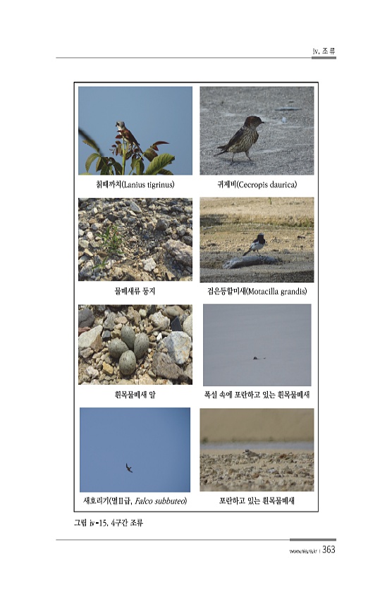 iv. 조 류 www.nie.re.kr ? 363 칡때까치 Lanius tigrinus 귀제비 Cecropis daurica 물떼새류 둥지 검은등할미새 Motacilla grandis 흰목물떼새 알 폭설 속에 포란하고 있는 흰목물떼새 새호리기 멸Ⅱ급, Falco subbuteo 포란하고 있는 흰목물떼새 그림 ⅳ-15. 4구간조류
