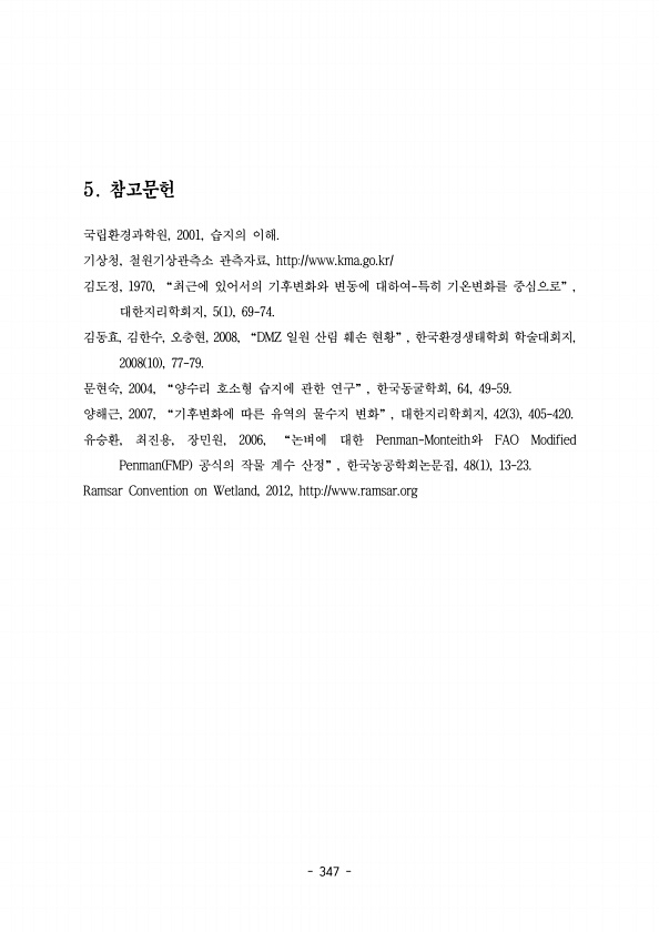 347 국립환경과학원 습지의 이해 , 2001, 기상청 철원기상관측소 관측자료 , , http//www.kma.go.kr/ 김도정 최근에 있어서의 기후변화와 변동에 대하여 특히 기온변화를 중심으로 , 1970, “ ”, 대한지리학회지, 5 1 , 69-74. 김동효 김한수 오충현 , , , 2008, “DMZ 일원 산림 훼손 현황 한국환경생태학회 학술대회지 ”, , 2008 10 , 77-79. 문현숙 양수리 호소형 습지에 관한 연구 한국동굴학회 , 2004, “ ”, , 64, 49-59. 양해근 기후변화에 따른 유역의 물수지 변화 대한지리학회지 , 2007, “ ” , , 42 3 , 405-420. 유승환 최진용 장민원 , , , 2006, “논벼에 대한 Penman-Monteith FAO Modifi...