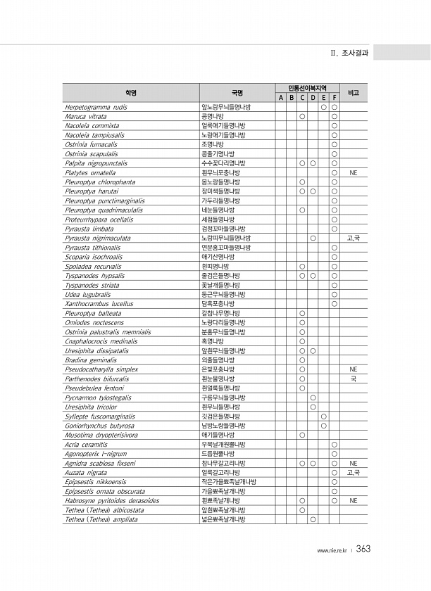 Ⅱ. 조사결과 www.nie.re.kr ? 363 학명 국명 민통선이북지역 비고 A B C D E F Herpetogramma rudis 앞노랑무늬들명나방 ○ ○ Maruca vitrata 콩명나방 ○ ○ Nacoleia commixta 얼룩애기들명나방 ○ Nacoleia tampiusalis 노랑애기들명나방 ○ Ostrinia furnacalis 조명나방 ○ Ostrinia scapulalis 콩줄기명나방 ○ Palpita nigropunctalis 수수꽃다리명나방 ○ ○ ○ Platytes ornatella 흰무늬포충나방 ○ NE Pleuroptya chlorophanta 몸노랑들명나방 ○ ○ Pleuroptya harutai 장미색들명나방 ○ ○ ○ Pleuroptya punctimarginalis 가...