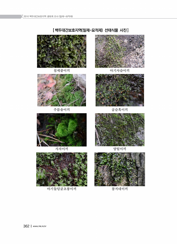 2016 백두대간보호지역 생태계 조사 밀재묘적재 362Ⅰwww.nie.re.kr [ 백두대간보호지역 밀재묘적재 선태식물 사진 ] 침세줄이끼 아기사슬이끼 주름솔이끼 곱슬혹이끼 사자이끼 양털이끼 아기들덩굴초롱이끼참지네이끼