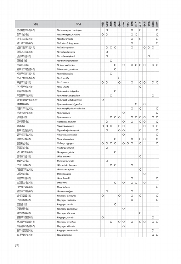 372 큰국화은무늬밤나방 Macdunnoughia crassisigna ○ ○ ○ ○ 은무늬밤나방 Macdunnoughia purissima ○ ○ ○ ○ ○ 애기띠꼬마밤나방 Maliattha arefacta ○ ○ ○ 앞노랑꼬마밤나방 Maliattha chalcogramma ○ ○ 넓은띠흰꼬마밤나방 Maliattha signifera ○ ○ ○ ○ ○ ○ ○ 굴뚝애기잎밤나방 Mecodina cineracea ○ 남방구리밤나방 Mecodina nubiferalis ○ ○ 창포밤나방 Mesapamea concinnata ○ 흰줄태극나방 Metopta rectifasciata ○ ○ ○ ○ ○ ○ ○ ○ 뒷무늬꼬마짤름나방 Micreremites pyraloides ○ 세모무늬꼬마밤나방 Microxyla conf...