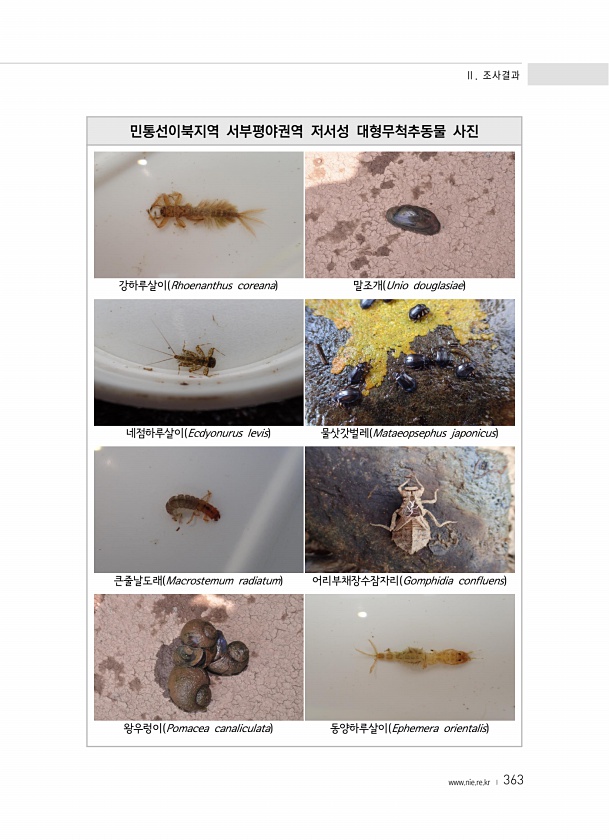 Ⅱ. 조사결과 www.nie.re.kr ? 363 민통선이북지역 서부평야권역 저서성 대형무척추동물 사진 강하루살이 Rhoenanthus coreana 말조개 Unio douglasiae 네점하루살이 Ecdyonurus levis 물삿갓벌레 Mataeopsephus japonicus 큰줄날도래 Macrostemum radiatum 어리부채장수잠자리 Gomphidia confluens 왕우렁이 Pomacea canaliculata 동양하루살이 Ephemera orientalis