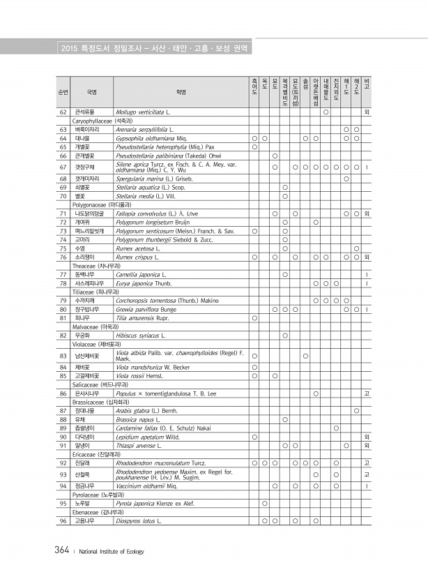 2015 특정도서 정밀조사 서산·태안·고흥·보성 권역 364 ? National Institute of Ecology 순번 국명 학명 흑어도 옥도 묘도 북격렬비도 묘도 토 끼 섬 솔섬 아랫돈배섬 내매물도 진지외도 해1도 해2도 비고 62 큰석류풀 Mollugo verticillata L. ○ 외 Caryophyllaceae 석죽과 63 벼룩이자리 Arenaria serpyllifolia L. ○ ○ 64 대나물 Gypsophila oldhamiana Miq. ○ ○ ○ ○ ○ ○ 65 개별꽃 Pseudostellaria heterophylla Miq. Pax ○ 66 큰개별꽃 Pseudostellaria palibiniana Takeda Ohwi ○ 67 갯장구채 Silene aprica Turcz. ex ...