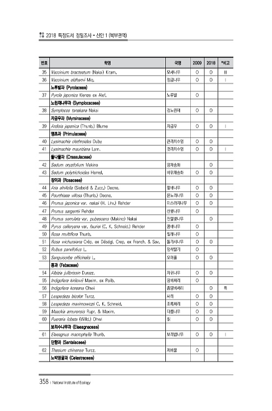 2018 특정도서 정밀조사 신안 1 북부권역 358 ? National Institute of Ecology 번호 학명 국명 2009 2018 *비고 35 Vaccinium bracteatum Nakai Kitam. 모새나무 O O Ⅲ 36 Vaccinium oldhamii Miq. 정금나무 O O Ⅰ 노루발과 Pyrolaceae 37 Pyrola japonica Klenze ex Alef. 노루발 O 노린재나무과 Symplocaceae 38 Symplocos tanakana Nakai 검노린재 O O 자금우과 Myrsinaceae 39 Ardisia japonica Thunb. Blume 자금우 O O Ⅰ 앵초과 Primulaceae 40 Lysimachia clethroides Duby 큰까치수염 O O...