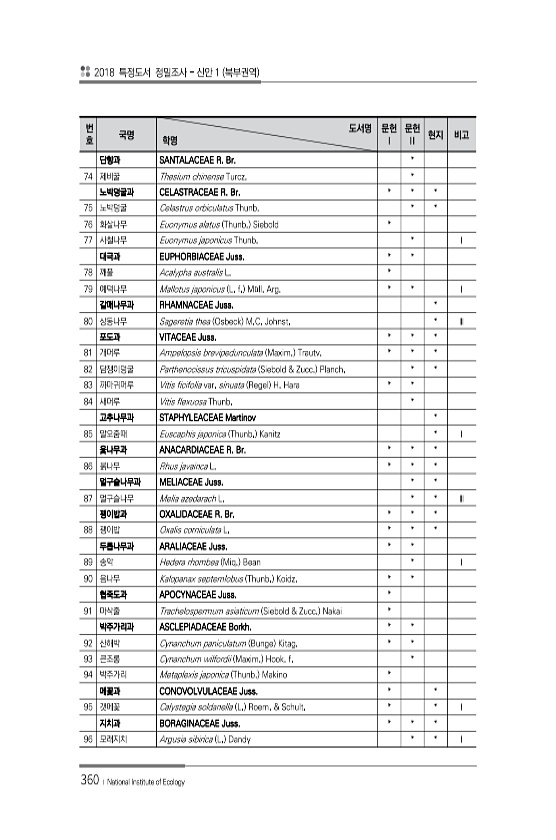 2018 특정도서 정밀조사 신안 1 북부권역 360 ? National Institute of Ecology 번 호 국명 도서명 학명 문헌 Ⅰ 문헌 Ⅱ 현지 비고 단향과 SANTALACEAE R. Br. * 74 제비꿀 Thesium chinense Turcz. * 노박덩굴과 CELASTRACEAE R. Br. * * * 75 노박덩굴 Celastrus orbiculatus Thunb. * * 76 화살나무 Euonymus alatus Thunb. Siebold * 77 사철나무 Euonymus japonicus Thunb. * Ⅰ 대극과 EUPHORBIACEAE Juss. * * 78 깨풀 Acalypha australis L. * 79 예덕나무 Mallotus japonicus L. f. M?ll. Ar...