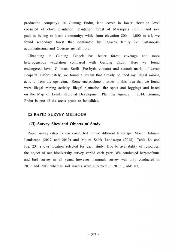 347 production company In Gunung Endut, land cover in lower elevation level consisted of clove plantation, plantation forest of Maesopsis eminii, and rice paddies belong to local community; while from elevation 800 1,000 m asl, we found secondary forest that dominated by Fagacea family i.e Castanopsis acuminatissima and Quercus gemelliflora. Cibandung in Gunung Tengek has better forest coverage an...