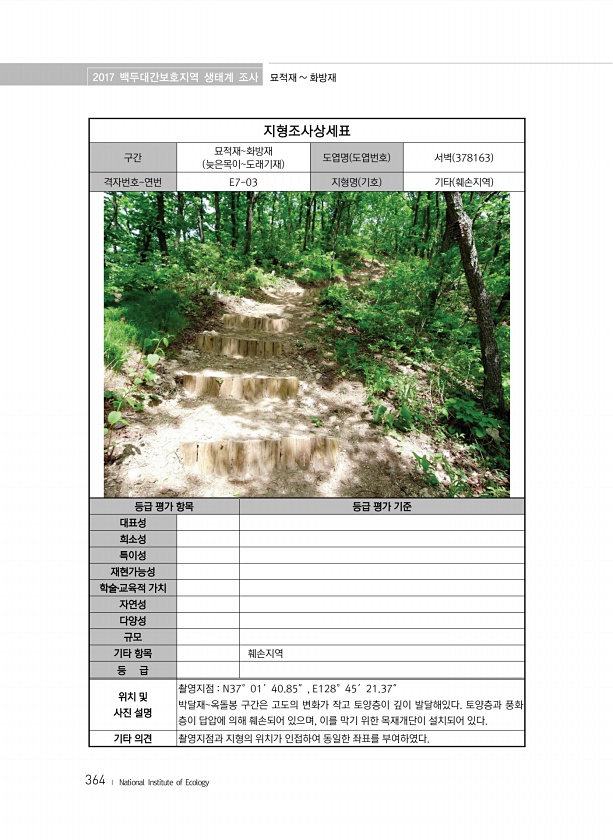 2017 백두대간보호지역 생태계 조사 묘적재 화방재 364 ? National Institute of Ecology 지형조사상세표 구간 묘적재화방재 늦은목이도래기재 도엽명 도엽번호 서벽 378163 격자번호-연번 E7-03 지형명 기호 기타 훼손지역 등급 평가 항목 등급 평가 기준 대표성 희소성 특이성 재현가능성 학술?교육적 가치 자연성 다양성 규모 기타 항목 훼손지역 등 급 위치 및 사진 설명 촬영지점 N37°01′40.85″, E128°45′21.37″ 박달재옥돌봉 구간은 고도의 변화가 작고 토양층이 깊이 발달해있다. 토양층과 풍화 층이 답압에 의해 훼손되어 있으며, 이를 막기 위한 목재개단이 설치되어 있다. 기타 의견 촬영지점과 지형의 위치가 인접하여 동일한 좌표를부여하였다.
