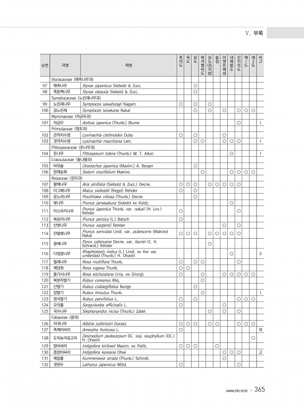 Ⅴ. 부록 www.nie.re.kr ? 365 순번 국명 학명 흑어도 옥도 묘도 북격렬비도 묘도 토 끼 섬 솔섬 아랫돈배섬 내매물도 진지외도 해1도 해2도 비고 Styracaceae 때죽나무과 97 때죽나무 Styrax japonicus Siebold & Zucc. ○ 98 쪽동백나무 Styrax obassia Siebold & Zucc. ○ Symplocaceae 노린재나무과 99 노린재나무 Symplocos sawafutagi Nagam. ○ ○ ○ 100 검노린재 Symplocos tanakana Nakai ○ ○ ○ ○ ○ ○ Myrsinaceae 자금우과 101 자금우 Ardisia japonica Thunb. Blume ○ Ⅰ Primulaceae 앵초과 102 큰까치수염 Lysimachia cl...