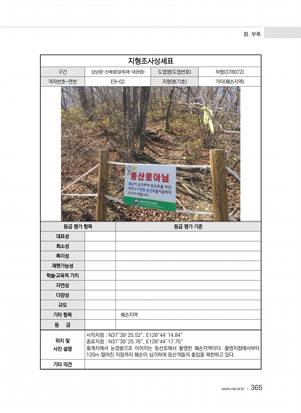 Ⅲ. 부록 www.nie.re.kr ? 365 지형조사상세표 구간 삽당령신배령 닭목재대관령 도엽명 도엽번호 차항 378072 격자번호-연번 E9-02 지형명 기호 기타 훼손지역 등급 평가 항목 등급 평가 기준 대표성 희소성 특이성 재현가능성 학술?교육적 가치 자연성 다양성 규모 기타 항목 훼손지역 등 급 위치 및 사진 설명 시작지점 N37°39′25.52″, E128°44′14.84″ 종료지점 N37°39′25.76″, E128°44′17.75″ 횡계치에서 능경봉으로 이어지는 등산로에서 촬영한 훼손지역이다. 촬영지점에서부터 120m 떨어진 지점까지 훼손이 심각하여 등산객들의 출입을 제한하고 있다. 기타의견