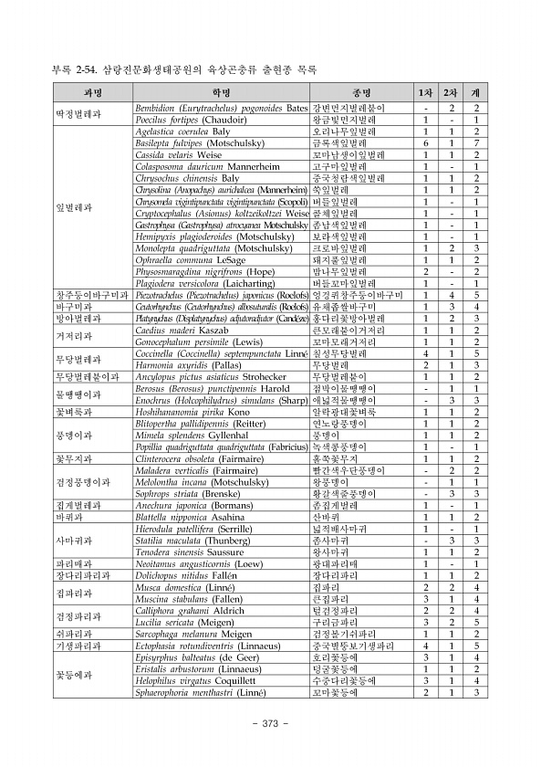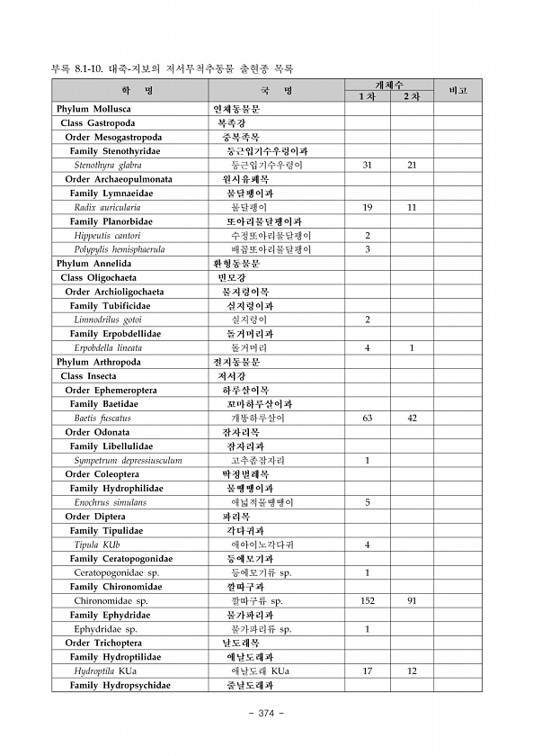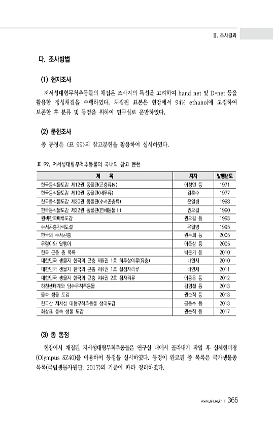 Ⅱ. 조사결과 www.nie.re.kr ? 365 다. 조사방법 1 현지조사 저서성대형무척추동물의 채집은 조사지의 특성을 고려하여 hand net 및 D-net 등을 활용한 정성채집을 수행하였다. 채집된 표본은 현장에서 94% ethanol에 고정하여 보존한 후 분류 및 동정을 위하여 연구실로 운반하였다. 2 문헌조사 종 동정은 표 99 의 참고문헌을 활용하여 실시하였다. 제 목 저자 발행년도 한국동식물도감 제12권 동물편 곤충류Ⅳ 이창언 등 1971 한국동식물도감 제19권 동물편 새우류 김훈수 1977 한국동식물도감 제30권 동물편 수서곤충류 윤일병 1988 한국동식물도감 제32권 동물편 연체동물Ⅰ 권오길 1990 원색한국패류도감 권오길 등 1993 수서곤충검색도설 윤일병 1995 한국의 수서곤충 원두희 ...