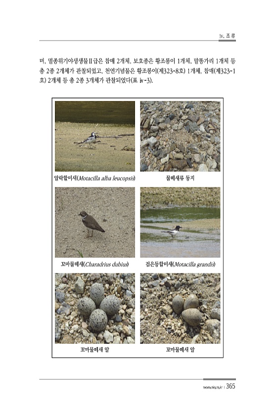 iv. 조 류 www.nie.re.kr ? 365 며, 멸종위기야생생물Ⅱ급은 참매 2개체, 보호종은 황조롱이 1개체, 말똥가리 1개체 등 총 2종 2개체가 관찰되었고, 천연기념물은 황조롱이 제323-8호 1개체, 참매 제323-1 호 2개체 등 총 2종 3개체가 관찰되었다 표 ⅳ-3 알락할미새 Motacilla alba leucopsis 물떼새류 둥지 꼬마물떼새 Charadrius dubius 검은등할미새 Motacilla grandis 꼬마물떼새 알 꼬마물떼새알
