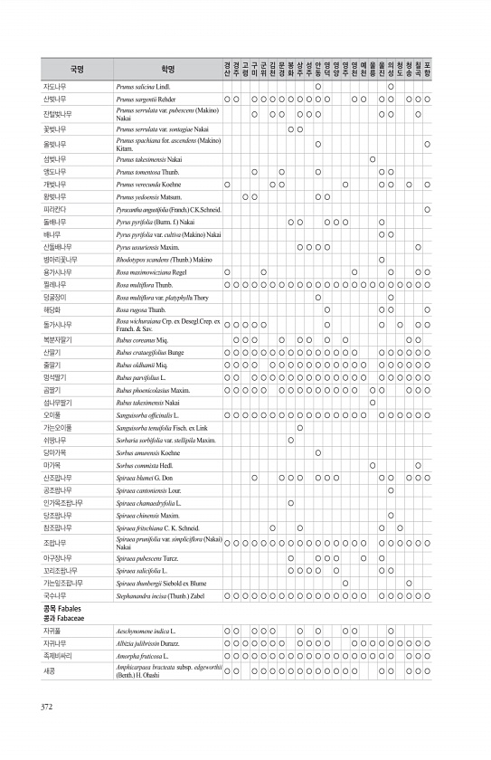 372 자도나무 Prunus salicina Lindl. ○ ○ 산벚나무 Prunus sargentii Rehder ○ ○ ○ ○ ○ ○ ○ ○ ○ ○ ○ ○ ○ ○ ○ ○ ○ ○ 잔털벚나무 Prunus serrulata var. pubescens Makino Nakai ○ ○ ○ ○ ○ ○ ○ ○ ○ 꽃벚나무 Prunus serrulata var. sontagiae Nakai ○ ○ 올벚나무 Prunus spachiana for. ascendens Makino Kitam. ○ ○ 섬벚나무 Prunus takesimensis Nakai ○ 앵도나무 Prunus tomentosa Thunb. ○ ○ ○ ○ ○ 개벚나무 Prunus verecunda Koehne ○ ○ ○ ○ ○ ○ ○ ○ 왕벚나무 Prunus...