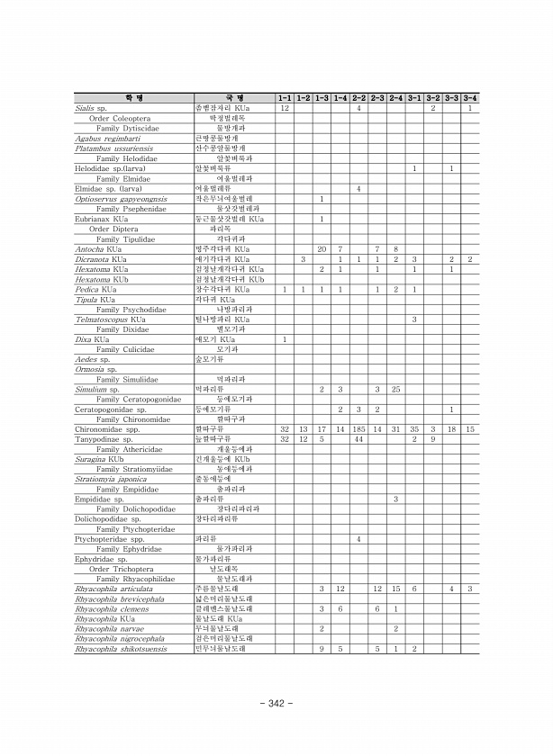 학 명 국 명 1-1 1-2 1-3 1-4 2-2 2-3 2-4 3-1 3-2 3-3 3-4 Sialis sp. 좀뱀잠자리 KUa 12 4 2 1 Order Coleoptera 딱정벌레목 Family Dytiscidae 물방개과 Agabus regimbarti 큰땅콩물방개 Platambus ussuriensis 산수콩알물방개 Family Helodidae 알꽃벼룩과 Helodidae sp. larva 알꽃벼룩류 1 1 Family Elmidae 여울벌레과 Elmidae sp. larva 여울벌레류 4 ...