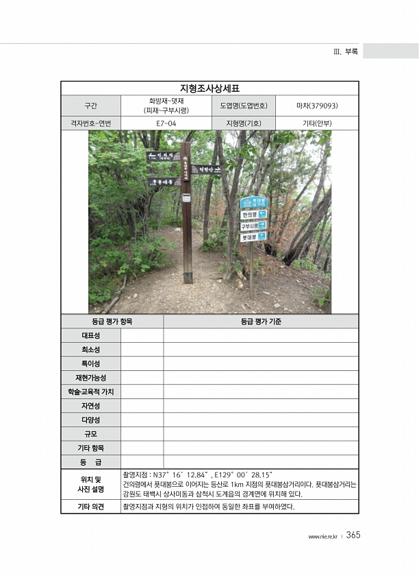 Ⅲ. 부록 www.nie.re.kr ? 365 지형조사상세표 구간 화방재댓재 피재구부시령 도엽명 도엽번호 마차 379093 격자번호-연번 E7-04 지형명 기호 기타 안부 등급 평가 항목 등급 평가 기준 대표성 희소성 특이성 재현가능성 학술?교육적 가치 자연성 다양성 규모 기타 항목 등 급 위치 및 사진 설명 촬영지점 N37°16′12.84″, E129°00′28.15″ 건의령에서 푯대봉으로 이어지는 등산로 1km 지점의 푯대봉삼거리이다. 푯대봉삼거리는 강원도 태백시 상사미동과 삼척시 도계읍의 경계면에 위치해 있다. 기타 의견 촬영지점과 지형의 위치가 인접하여 동일한 좌표를부여하였다.