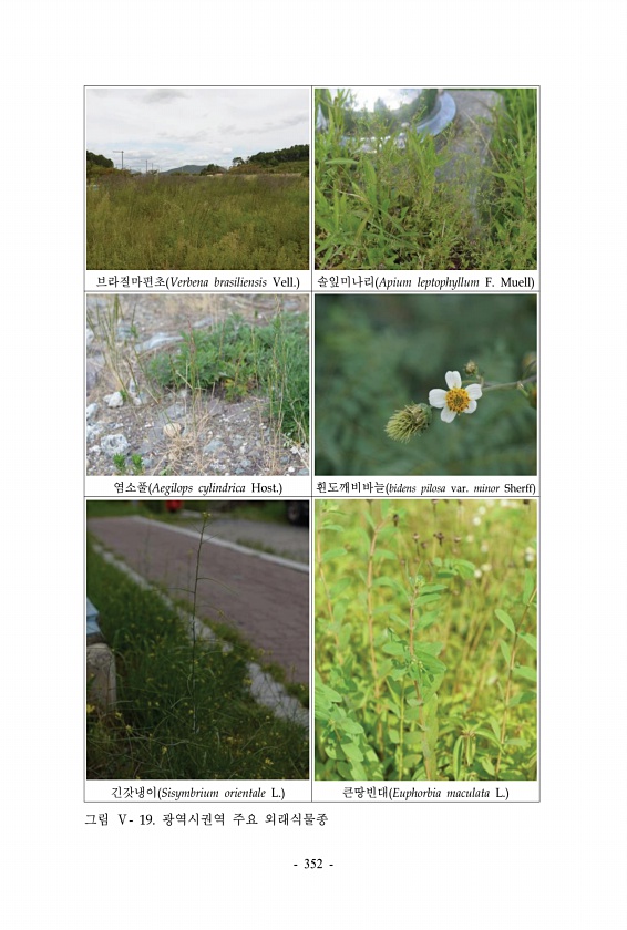 브라질마편초 Verbena brasiliensis Vell. 솔잎미나리 Apium leptophyllum F. Muell 염소풀 Aegilops cylindrica Host. 흰도깨비바늘 bidens pilosa var. minor Sherff 긴갓냉이 Sisymbrium orientale L. 큰땅빈대 Euphorbia maculata L. 그림 Ⅴ- 19. 광역시권역 주요 외래식물종 352
