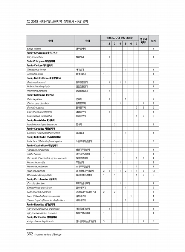 2018 생태·경관보전지역 정밀조사 동강유역 362 ? National Institute of Ecology 학명 국명 중점조사구역 관찰 개체수 중점외 1 2 3 4 5 6 7 지역* 합계 Baliga micans 명주잠자리 1 1 Family Chrysopidae 풀잠자리과 Chrysopa intima 풀잠자리 1 1 Order Coleoptera 딱정벌레목 Family Cleridae 개미붙이과 Thanasimus lewisi 개미붙이 1 1 Trichodes sinae 불개미붙이 1 1 Family Melolonthidae 검정풍뎅이과 Gastroserica herzi 줄우단풍뎅이 1 1 1 3 Holotrichia diomphalia 참검정풍뎅이 1 1 Holotrichia parallela 큰검정풍...