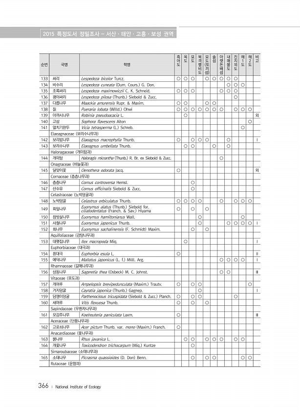 2015 특정도서 정밀조사 서산·태안·고흥·보성 권역 366 ? National Institute of Ecology 순번 국명 학명 흑어도 옥도 묘도 북격렬비도 묘도 토 끼 섬 솔섬 아랫돈배섬 내매물도 진지외도 해1도 해2도 비고 133 싸리 Lespedeza bicolor Turcz. ○ ○ ○ ○ ○ ○ ○ ○ 134 비수리 Lespedeza cuneata Dum. Cours. G. Don. ○ ○ ○ 135 조록싸리 Lespedeza maximowiczii C. K. Schneid. ○ ○ ○ ○ ○ ○ 136 괭이싸리 Lespedeza pilosa Thunb. Siebold & Zucc. ○ 137 다릅나무 Maackia amurensis Rupr. & Maxim. ○ ○ ○ ○ 138 칡 Puer...