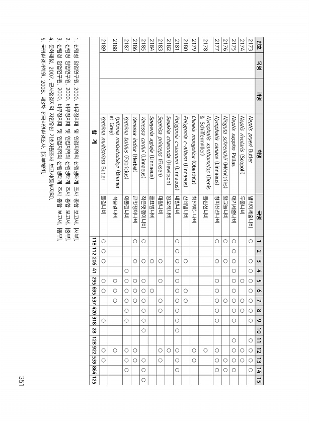 351 번호 목명 과명 학명 국명 1 2 3 4 5 6 7 8 9 10 11 12 13 14 15 2173 Neptis pryeri Butler 별박이세줄나비 ○ ○ ○ ○ ○ ○ ○ ○ ○ ○ ○ ○ 2174 Neptis rivularis Scopoli 두줄나비 ○ ○ ○ ○ ○ 2175 Neptis sappho Pallas 애기세줄나비 ○ ○ ○ ○ ○ ○ ○ ○ ○ ○ ○ ○ ○ 2176 Ninguta schrenckii M?n?tri?s 왕그늘나비 ○ ○ ○ ○ ○ 2177 Nymphalis canace Linnaeus 청띠신선나비 ○ ○ ○ ○ ○ ○ ○ ○ ○ ○ 2178 Nymphalis xanthomelas Denis & Schifferm?ller 들신선나비 ○ 2179 Oeneis mongo...