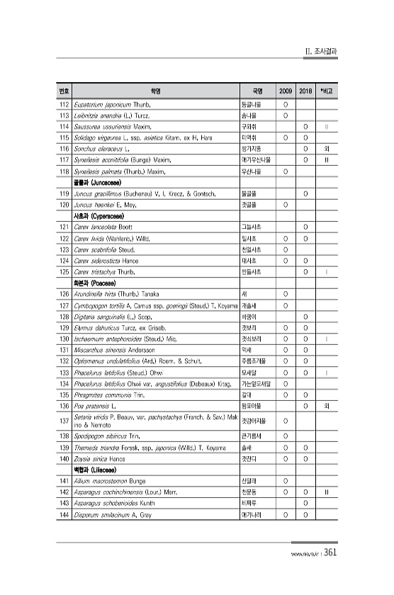 II. 조사결과 www.nie.re.kr ?361 번호 학명 국명 2009 2018 *비고 112 Eupatorium japonicum Thunb. 등골나물 O 113 Leibnitzia anandria L. Turcz. 솜나물 O 114 Saussurea ussuriensis Maxim. 구와취 O Ⅱ 115 Solidago virgaurea L. ssp. asiatica Kitam. ex H. Hara 미역취 O O 116 Sonchus oleraceus L. 방가지똥 O 외 117 Syneilesis aconitifolia Bunge Maxim. 애기우산나물 O Ⅲ 118 Syneilesis palmata Thunb. Maxim. 우산나물 O 골풀과 Juncaceae 119 Juncus gracilli...