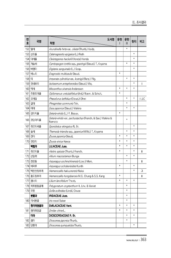 II. 조사결과 www.nie.re.kr ?363 번 호 국명 도서명 학명 문헌 Ⅰ 문헌 Ⅱ 현지 비고 152 털새 Arundinella hirta var. ciliata Thunb. Koidz. * 153 산조풀 Calamagrostis epigeios L. Roth * 154 대새풀 Cleistogenes hackelii Honda Honda * 155 개솔새 Cymbopogon tortilis ssp. goeringii Steud. T. Koyama * * 156 바랭이 Digitaria sanguinalis L. Scop. * 157 비노리 Eragrostis multicaulis Steud. * 158 띠 Imperata cylindrica var. koenigii Retz. Pilg. * * 15...