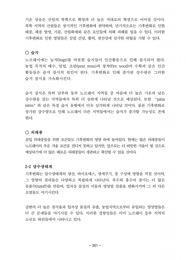 기온 상승은 산림의 북쪽으로 확장과 더 높은 지대로의 확장으로 이어질 것이다. 북쪽 지역의 산림들은 장기적인 기후변화에 취약하며, 단기적으로는 기후변화로 인한 태풍, 해충 발생, 가뭄, 산림화재와 같은 요인들에 의해 피해를 입을 수 있다. 이러한 기후변화로 인한 영향들은 삼림 건강, 활력, 생산성에 심각한 위협을 가할 수 있다. ○ 습지 노르웨이에는 늪지 bogs 를 비롯한 습지들이 인간활동으로 인해 침식되어 왔다. 농업 목적의 배수, 임업, 초탄 peat moss 과 장작 fire wood 의 수확과 같은 인간 활동들은 습지 침식의 원인이 된다. 기후변화로 인해 증가된 강수량은 그러한 습지 침식을 가속화시킨다. 습지 침식은 특히 남부와 동부 노르웨이 지역들 중 여름에 더 높은 기온과 낮은 강수량을 갖는 지...