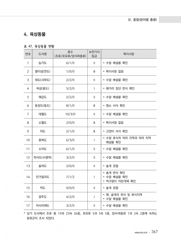 Ⅲ. 종합 분야별 총평 www.nie.re.kr ? 367 4. 육상동물 표 47. 육상동물 현황 번호 도서명 종수 조류/포유류/양서파충류 보전가치 등급 특이사항 1 농가도 6/1/0 Ⅱ ? 수달 배설물 확인 2 별이섬 연도 1/0/0 Ⅲ ? 특이사항 없음 3 태도 사파도 2/2/0 Ⅱ ? 수달 배설물 확인 4 쑥섬 봉도 5/2/0 Ⅰ ? 왜가리 집단 번식 확인 5 해갑도 2/2/0 Ⅱ ? 수달 배설물 확인 6 동장도 동도 8/1/0 Ⅲ ? 염소 서식 확인 7 대혈도 10/3/0 Ⅱ ? 수달 배설물 확인 8 소혈도 2/0/0 Ⅲ ? 특이사항 없음 9 저도 2/1/0 Ⅲ ? 고양이 서식 확인 10 충복도 6/3/0 Ⅰ ? 수달 휴식처 여러 지역과 여러 지역 배설물 확인 11 소덕도 6/1/0 Ⅱ ? 수달 배설...