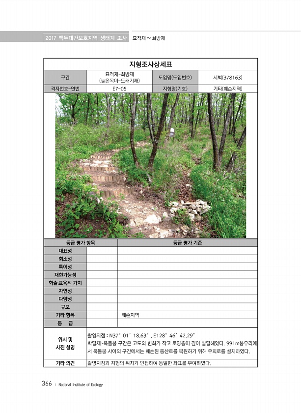 2017 백두대간보호지역 생태계 조사 묘적재 화방재 366 ? National Institute of Ecology 지형조사상세표 구간 묘적재화방재 늦은목이도래기재 도엽명 도엽번호 서벽 378163 격자번호-연번 E7-05 지형명 기호 기타 훼손지역 등급 평가 항목 등급 평가 기준 대표성 희소성 특이성 재현가능성 학술?교육적 가치 자연성 다양성 규모 기타 항목 훼손지역 등 급 위치 및 사진 설명 촬영지점 N37°01′18.63″, E128°46′42.29″ 박달재옥돌봉 구간은 고도의 변화가 작고 토양층이 깊이 발달해있다. 991m봉우리에 서 옥돌봉 사이의 구간에서는 훼손된 등산로를 복원하기 위해 우회로를 설치하였다. 기타 의견 촬영지점과 지형의 위치가 인접하여 동일한 좌표를부여하였다.