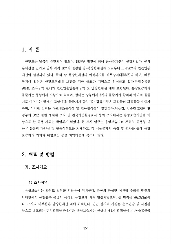 351 한반도는 남북이 분단되어 있으며 년 정전에 의해 군사분계선이 설정되었다 군사 , 1957 분계선을 근거로 남북 각각 씩 설정한 남 북방한계선과 그로부터 의 민간인통 2km 1015km 제선이 설정되어 있다 특히 남 북방한계선의 이북까지를 비무장지대 라 하며 비무 DMZ , 장지대 일원은 한반도생태계 보전을 위한 중요한 지역으로 인식하고 있다 국립수목원 2014 조사구역 전체가 민간인출입통제구역 및 남방한계선 내에 포함된다 용양보습지의 물줄기는 동향에서 서향으로 흐르며 형태는 상부에서 개의 물줄기가 합쳐져 하나의 물줄 , 3 기로 이어지는 깔때기 모양이다 물줄기가 합쳐지는 합류지점은 퇴적물의 퇴적활동이 증가 하며 이러한 입지는 다년생초본식생 및 연목림식생이 발달한다 이율경 김종원 환 , , 2006 경...