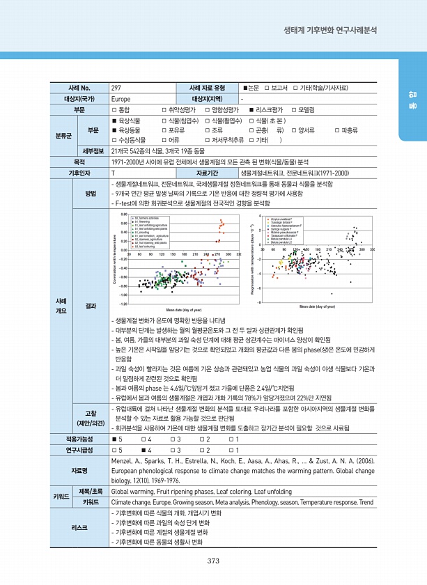 373 생태계 기후변화 연구사례분석 통 합 사례 No. 297 사례 자료 유형 ■논문 □ 보고서 □ 기타 학술/기사자료 대상지 국가 Europe 대상지 지역 부문 □ 통합 □ 취약성평가 □ 영향성평가 ■ 리스크평가 □ 모델링 분류군 부문 ■ 육상식물 □ 식물 침엽수 □ 식물 활엽수 □ 식물 초 본 ■ 육상동물 □ 포유류 □ 조류 □ 곤충 류 □ 양서류 □ 파충류 □ 수상동식물 □ 어류 □ 저서무척추류 □ 기타 세부정보 21개국 542종의 식물, 3개국 19종 동물 목적 1971-2000년 사이에 유럽 전체에서 생물계절의 모든 관측 된 변화 식물/동물 분석 기후인자 T 자료기간 생물계절네트워크, 전문네트워크 1971-2000 사례 개요 방법 생물계절네트워크, 전문네트워크, 국제생물계절 정원네트워크를 통해 동물...