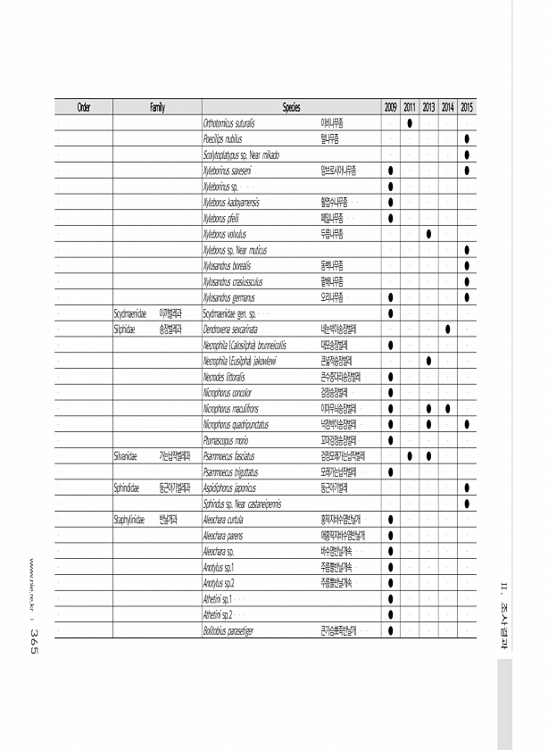 365 Order Family Species 2009 2011 2013 2014 2015 Orthotomicus suturalis 이비나무좀 ● Poecilips nubilus 털나무좀 ● Scolytoplatypus sp. Near mikado ● Xyleborinus saxeseni 암브로시아나무좀 ● ● Xyleborinus sp. ● Xyleborus kadoyamensis 활엽수나무좀 ● Xyleborus pfeili 페일나무좀 ● Xyleborus volvulus 두릅나무좀 ● Xyleborus sp. Near muticus ● Xylosandrus bo...