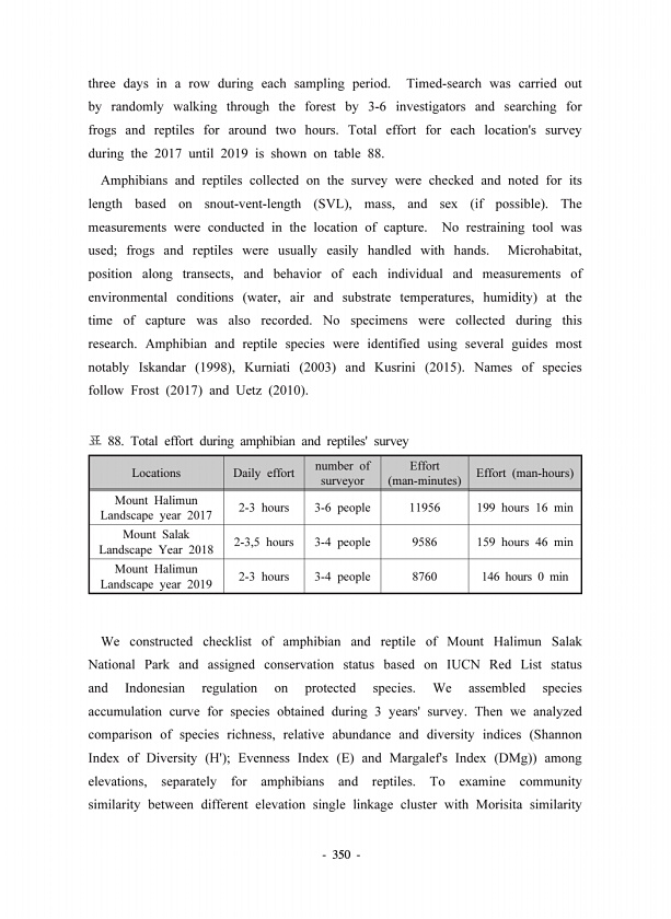 350 three days in a row during each sampling period. Timed-search was carried out by randomly walking through the forest by 3-6 investigators and searching for frogs and reptiles for around two hours. Total effort for each locations survey during the 2017 until 2019 is shown on table 88. Amphibians and reptiles collected on the survey were checked and noted for its length based on snout-vent-lengt...