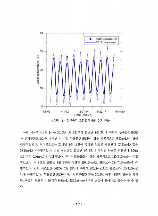 1115 그림 13 침실습지 고달교에서의 수온 변화 아래 제시된 그림 14 는 2010년 1월 6일부터 2019년 8월 3일에 측정된 부유물질양 SS 과 전기전도도 EC 를 나타낸 것이다. 부유물질양 SS 의 경우 평균적으로 6.9 ㎎-L 의 양이 측정되었으며, 최대값으로는 2011년 8월 12일에 측정된 양으로 평균보다 52.3 ㎎-L 많은 59.2 ㎎-L 가 측정되었다. 반면 최소값은 2019년 1월 8일에 측정된 양으로 평균보다 6.5 ㎎ -L 적은 0.4 ㎎-L 가 측정되었다. 전기전도도 EC 의 경우 평균적으로 185.3 ?S-㎝ 이 측정 되었으며, 최대값은 2010년 1월 6일에 측정된 410 ?S-㎝ 로 평균보다 224.7 ?S-㎝ 높게 측 정되었다. 반면 최소값은 2012년 7월 18일에 측정...