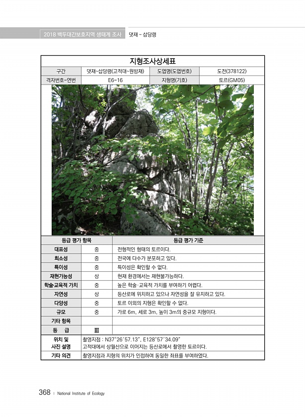 2018 백두대간보호지역 생태계 조사 댓재 삽당령 368 ? National Institute of Ecology 지형조사상세표 구간 댓재삽당령 고적대원방재 도엽명 도엽번호 도전 378122 격자번호-연번 E6-16 지형명 기호 토르 GM05 등급 평가 항목 등급 평가 기준 대표성 중 전형적인 형태의 토르이다. 희소성 중 전국에 다수가 분포하고 있다. 특이성 중 특이성은 확인할 수 없다. 재현가능성 상 현재 환경에서는 재현불가능하다. 학술?교육적 가치 중 높은 학술·교육적 가치를 부여하기 어렵다. 자연성 상 등산로에 위치하고 있으나 자연성을 잘 유지하고 있다. 다양성 중 토르 이외의 지형은 확인할 수 없다. 규모 중 가로 6m, 세로 3m, 높이 3m의 중규모 지형이다. 기타 항목 등 급 Ⅲ 위치 및 사진 ...