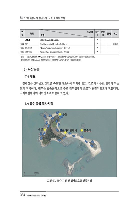 2018 특정도서 정밀조사 신안 1 북부권역 364 ? National Institute of Ecology 5 갈매섬은 전라남도 신안군 증도면 대초리에 위치해 있고, 간조시 사주로 연결이 되는 도서 지역이다. 대부분 곰솔군락으로 주로 관목림에서 조류가 관찰되었으며 흰물떼새, 쇠제비갈매기의 먹이장소로 이용하고 있다. 그림 50. 조사 지점 및 법정보호종 관찰지점 번 호 국명 도서명 학명 문헌 Ⅰ 문헌 Ⅱ 현지 비고 난초과 ORCHIDACEAE Juss. * 184 자란 Bletilla striata Thunb. Rchb. f. * Ⅲ,LC 185 산제비란 Platanthera mandarinorum Rchb. f. * 186 타래난초 Spiranthes sinensis Pers. Ames * 문헌Ⅰ임동옥, ...